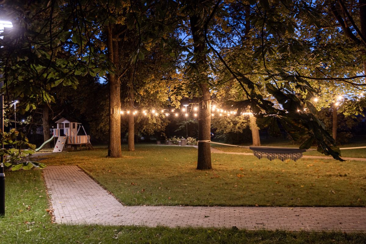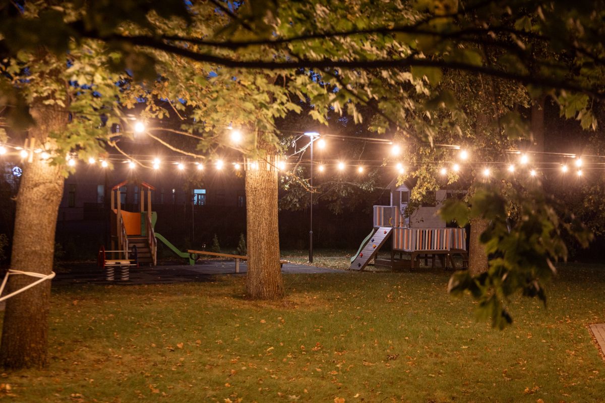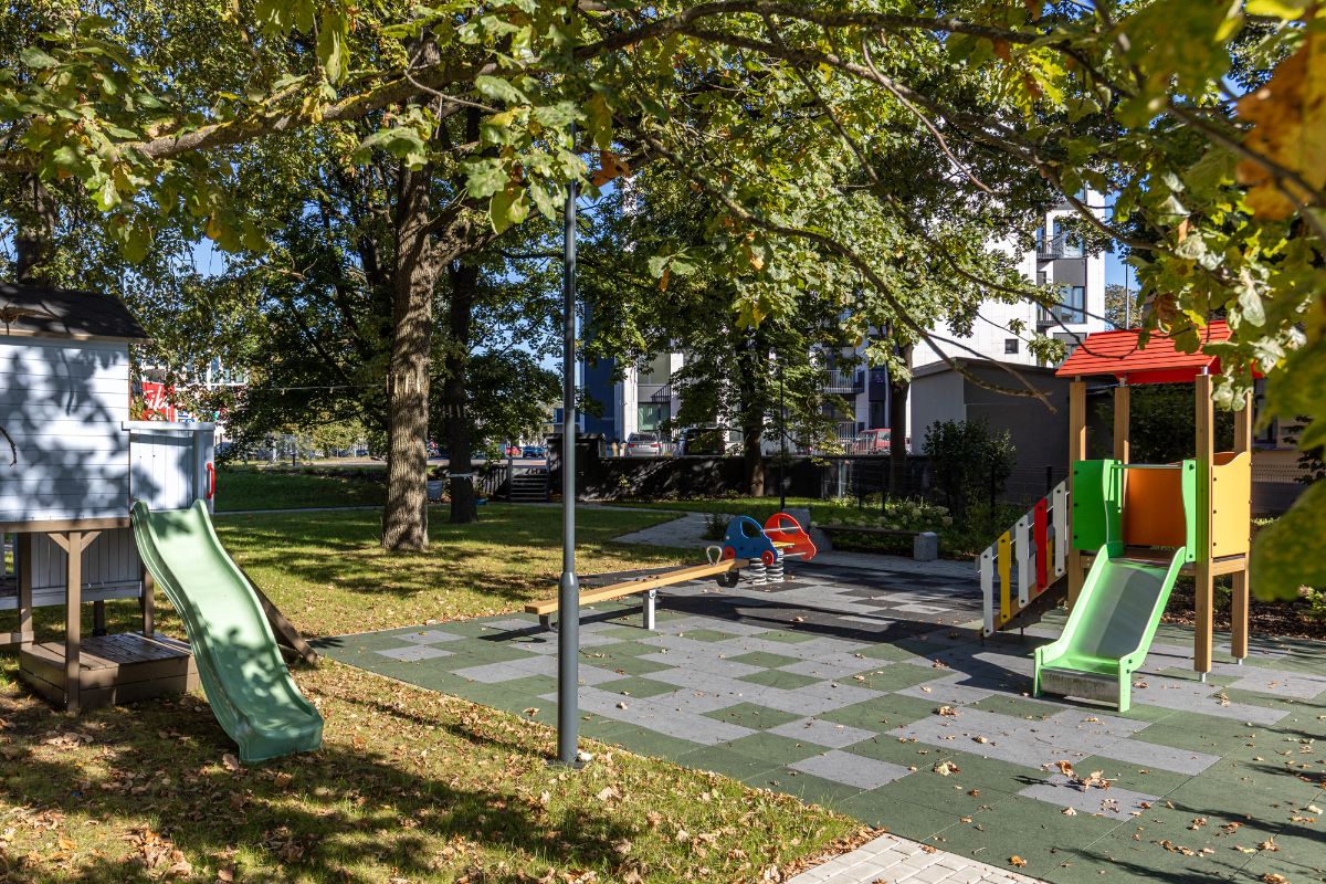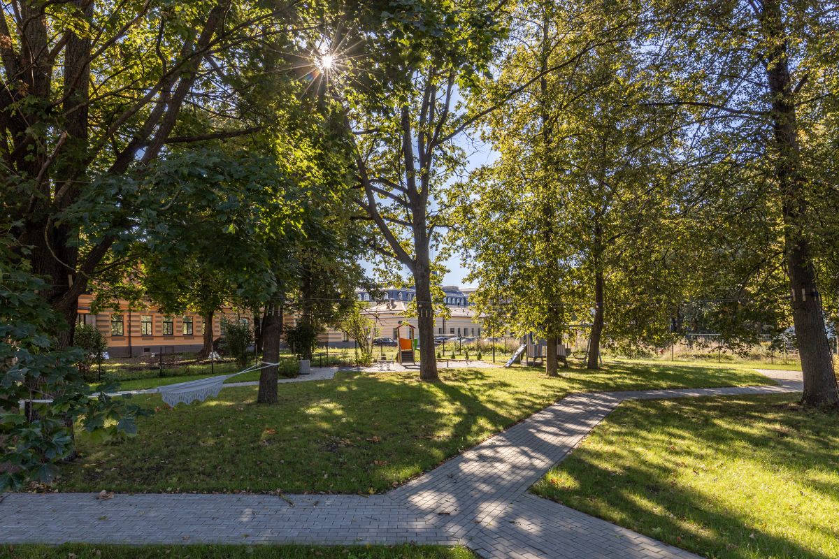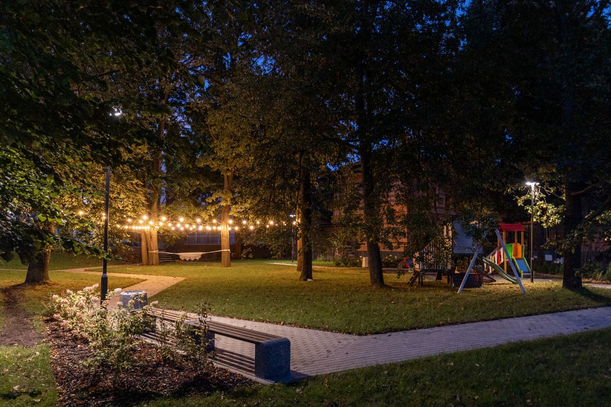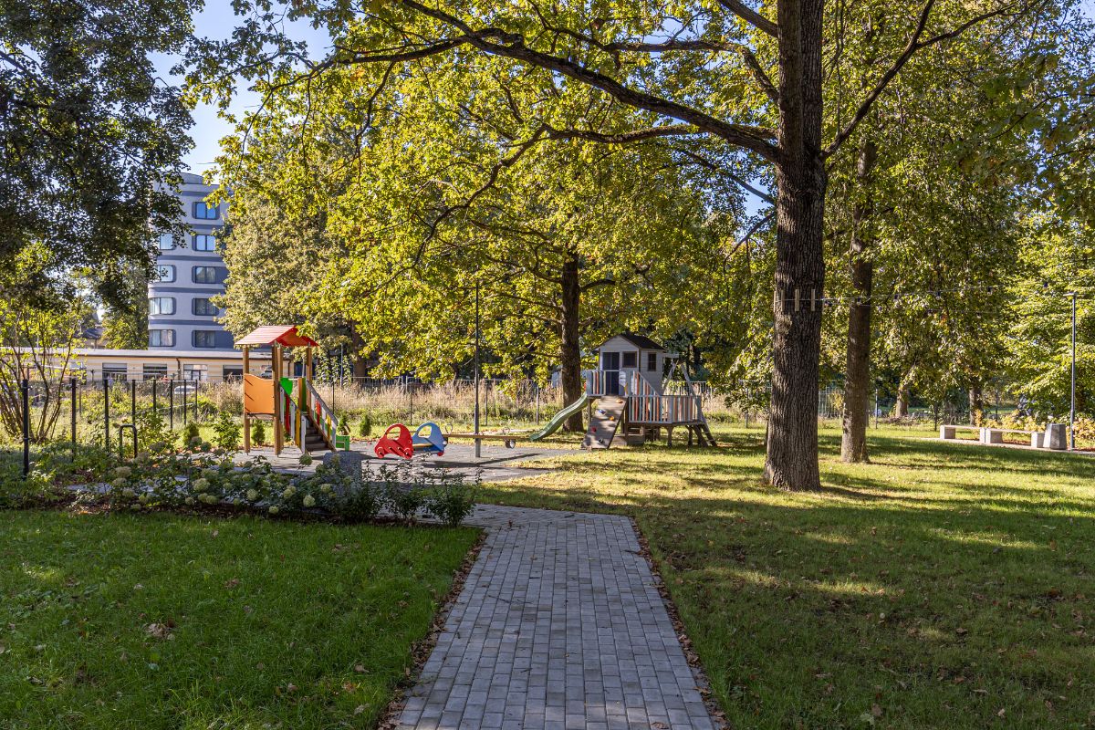 Sava parka teritorija ar simtgadīgiem kokiem, soliņiem un bērnu rotaļu laukumu